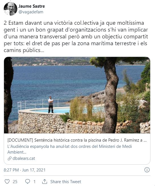 Así, Jaume Sastre, quien en 2004 acudió junto a un notario a la piscina del periodista para denunciar la situación, ha asegurado que la sentencia del tribunal “es una victoria, no definitiva, porque todavía pueden recurrir ante el Supremo, pero nosotros hemos persistido porque estamos convencidos que tenemos razón”.