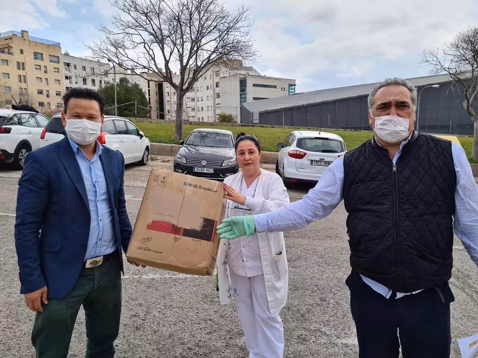 Alfonso Robledo, presidente de la Asociación de Bares, Restaurantes y Cafeterías de Mallorca, Restauración Mallorca CAEB y Shenkian Ye, presidente de la Asociación de Intercambio Gastronómico de China en Mallorca, han hecho entrega de 250 mascarillas al Hospital Psiquiátrico de Palma perteneciente al IbSalut.