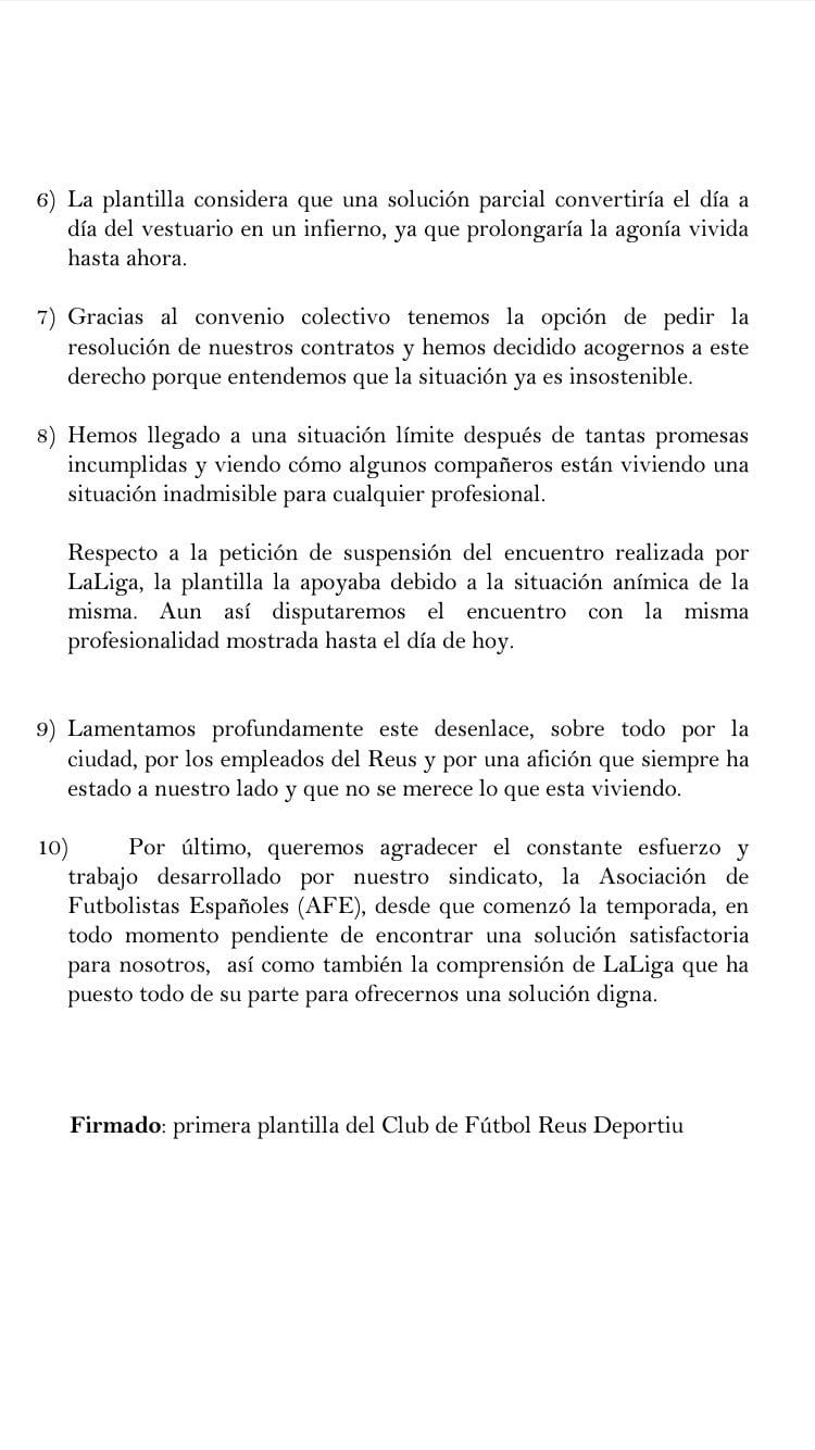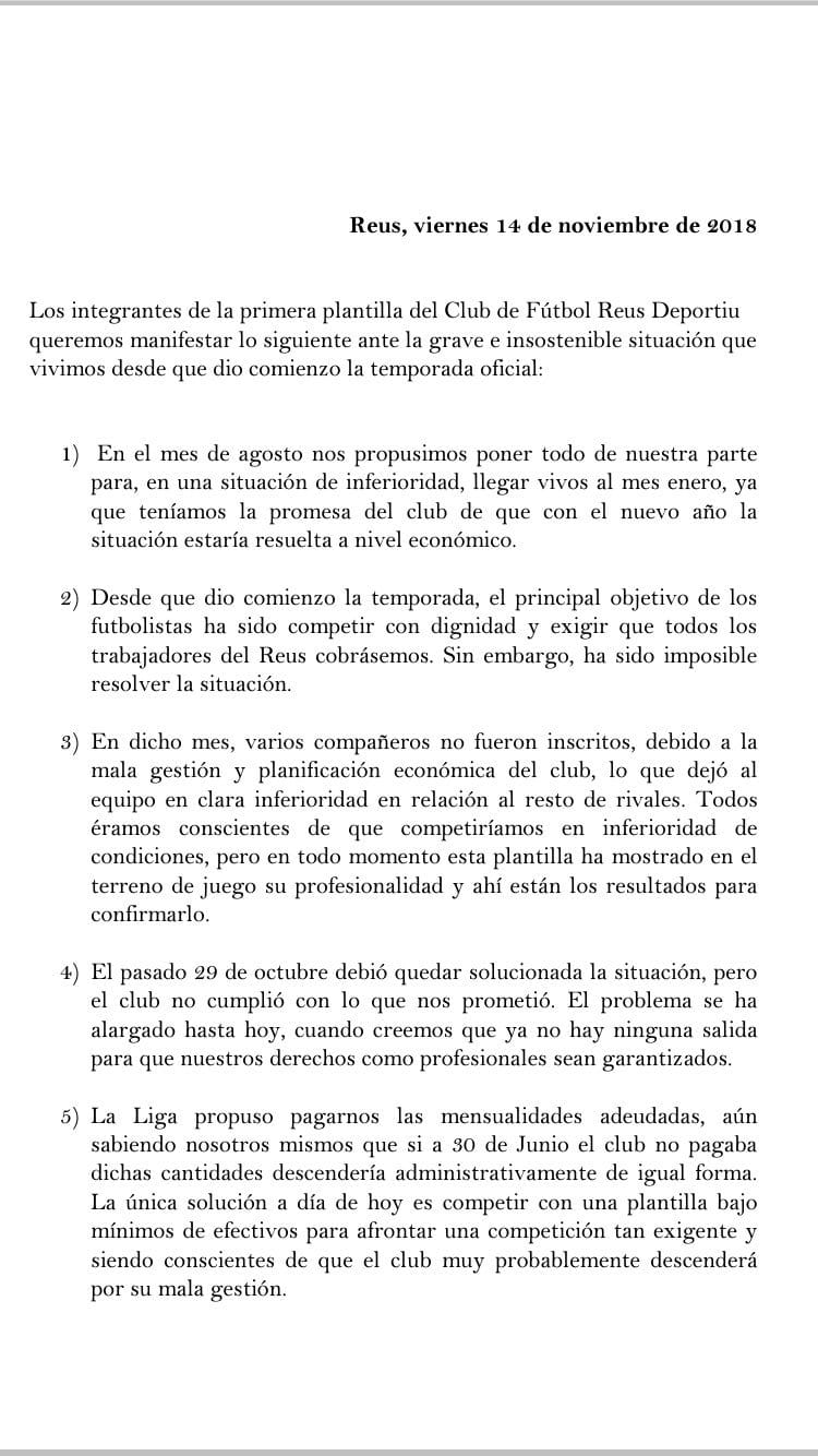 La plantilla del Reus Deportiu anunció este viernes su decisión de rescindir sus contratos con el club catalán, después de no haber cobrado los últimos tres meses de competición.