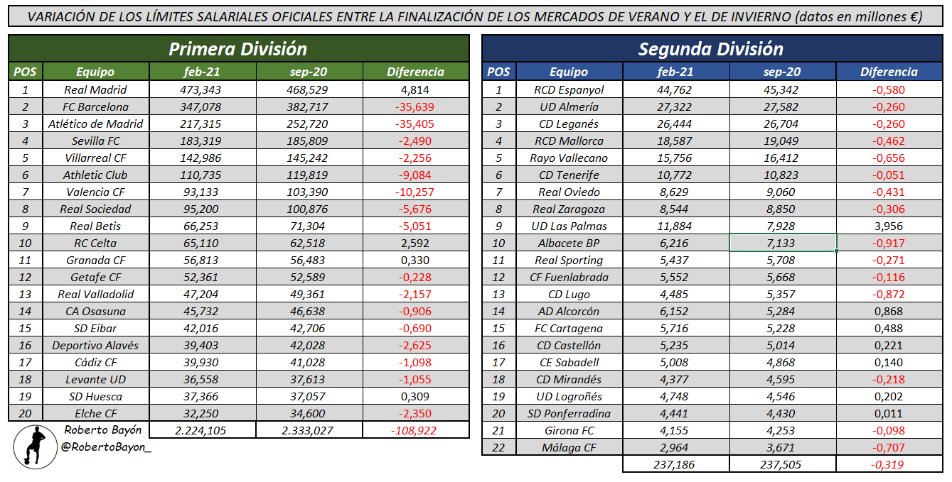 La Liga ha comunicado de forma oficial los límites salariales de los equipos de la Liga Santander y de la Liga Smartbank.