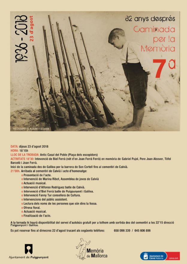 Como cada año, se realizará un acto de homenaje en el cementerio de Calvià donde en 2015 el Ajuntament de Calvià y Memòria de Mallorca instalaron un monolito con una placa conmemorativa en la que se recuerdan los nombres de las víctimas desaparecidas por la represión franquista y que se encuentran en la fosa común del cementerio calvianer.