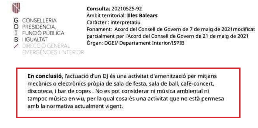 Según consta literalmente en un documento del Govern balears “la actuación de un DJ es una actividad de amenización per medios mecánicos o electrónicos propia de una sala de siesta, sala de baile, café-concierto, discoteca y bar de copas. No se puede considerar ni música ambiental ni tampoco música en vivo, por lo que es una actividad que no está permitida con la normativa actualmente vigente”.