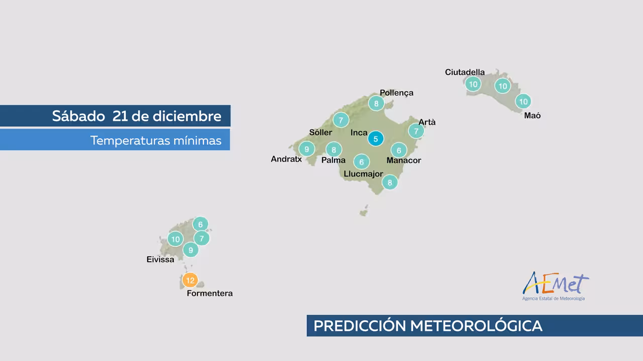 El domingo, día 22 de diciembre, mientras los Niños de San Ildefonso cantan los números y premios del Sorteo Extraordinario de la Lotería de la Navidad, el cielo se mostrará poco nuboso sobre las Islas Baleares, por lo cual (y con la incidencia del sol) las temperaturas ascenderán en los termómetros. Se esperan máximas medias de hasta 19 grados, incluso de 20 en las zonas menos expuestas al viento.