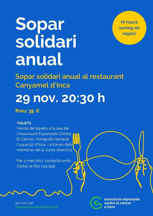 La solidaridad volverá a ser protagonista en Inca el próximo 29 de noviembre a las 20:30 h, con la celebración de la Cena Solidaria Anual organizada por la Asociación Española Contra el Cáncer (AECC) de Inca. El evento tendrá lugar en el restaurante Canyamel d’Inca, un espacio acogedor que abrirá sus puertas para recibir a todas las personas que quieran contribuir a una causa esencial: apoyar la lucha contra el cáncer.