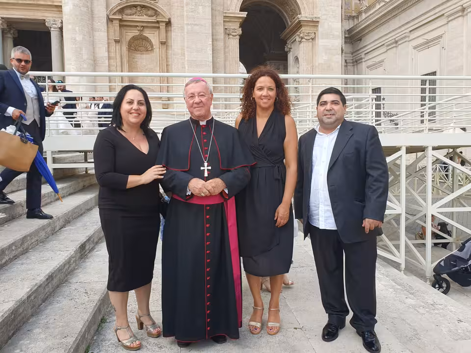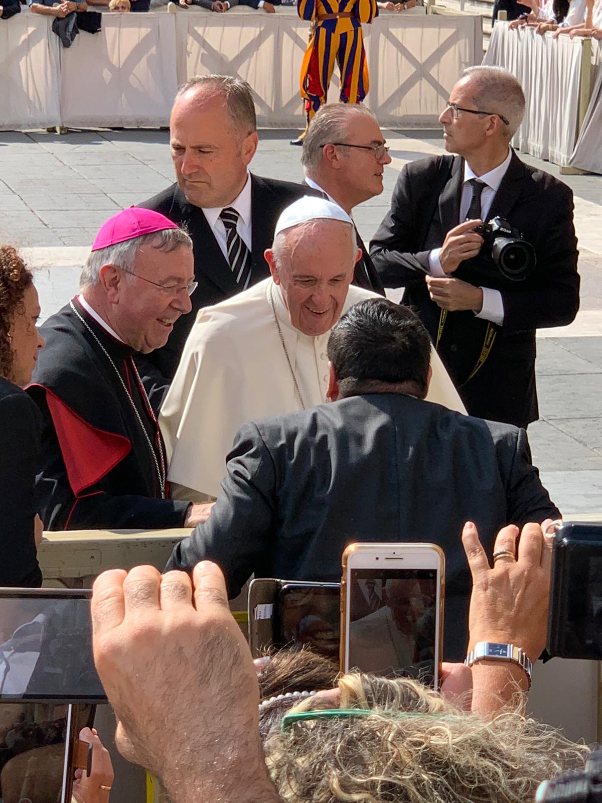 Acompañado de una numerosa comitiva compuesta por familiares y amigos y por el Obispo de Mallorca: Javier Salinas, la Presidenta del Consell de Mallorca: Catalina Cladera y el hermano de Mesas, Nico Martínez, ha sido recibido por el Papa Francisco bajo un sol de justicia, un 2 de octubre de 2019.