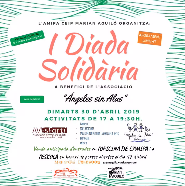 El próximo martes 30 de abril, la AMIPA del Ceip Marián Aguiló de Palma organiza la I Diada Solidaria. Todo lo que se recaude en la diada será a beneficio de la Asociación Ángeles sin alas.