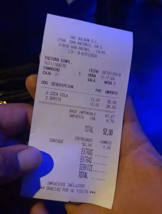 52 euros por dos Coca-Cola y dos Sprite. Un bar de Eivissa se aprovecha de los consumidores y les cobra precios desorbitados por tomar algo.