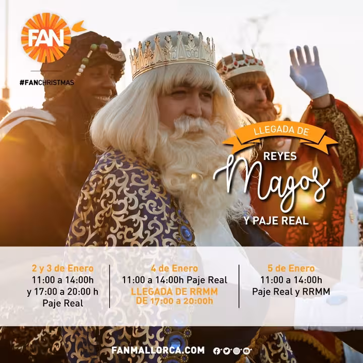 FAN Mallorca Shopping recibe la visita de Sus Majestades los Reyes Magos de Oriente que realizarán su esperada entrada el sábado 4 de enero, a las 17.00 horas, y permanecerán en el centro hasta el domingo 5 por la mañana.