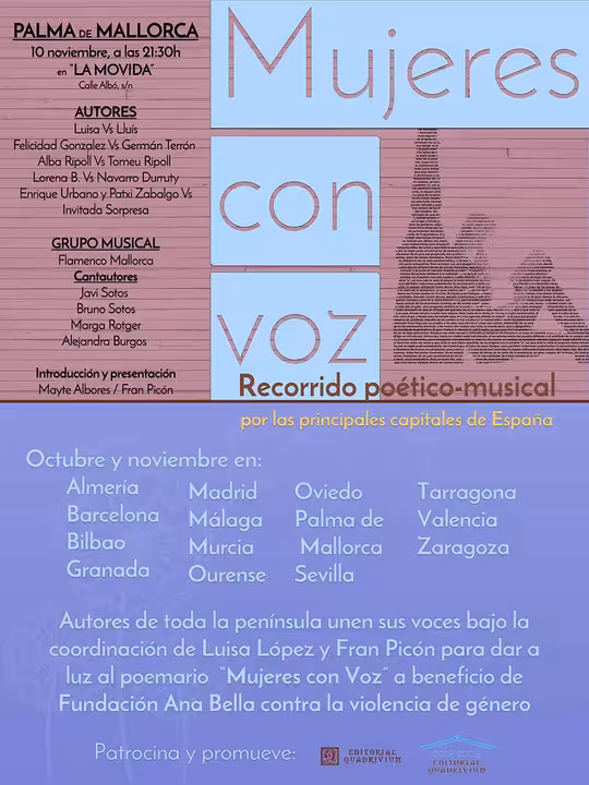 'Mujeres con voz' llega a Palma. El próximo 10 de noviembre a partir de las 21.30h en 'La Movida' presentarán un poemario en torno al problema de la violencia de género, como un alegato contra el silencio que esconde esta lacra social.