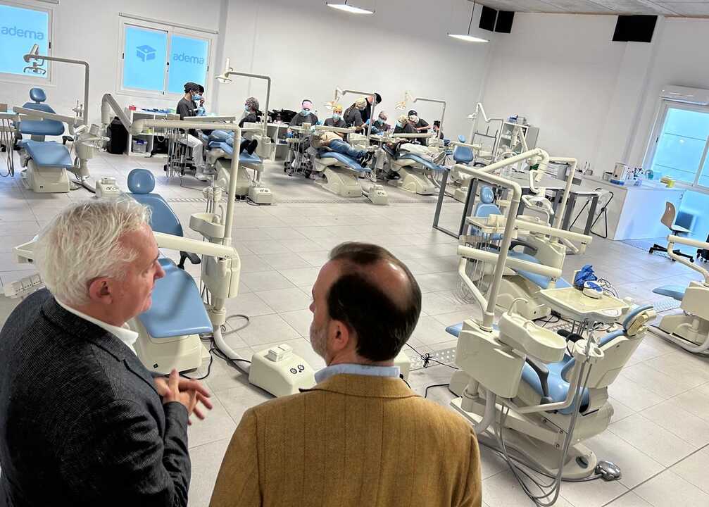 La visita ha continuado en la Clínica Universitaria Integrada, que dispone de más de mil metros cuadrados dedicados a la formación y a la atención sanitaria en un entorno completamente digitalizado. La clínica cuenta con cuarenta y cinco boxes equipados con tecnología tridimensional y sistemas avanzados de diagnóstico y tratamiento, entre ellos TAC CBCT, escáner intraoral, impresoras tridimensionales y microscopios digitales. Estos recursos permiten integrar la tecnología en la formación del alumnado y en la actividad asistencial desarrollada bajo supervisión profesional.