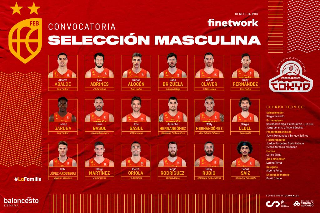 Ocho campeones del mundo en 2019 (Ricky Rubio, Sergio Llull, Rudy Fernández, Víctor Claver, Juancho Hernangómez, Willy Hernangómez, Marc Gasol y Pierre Oriola), los regresos de Pau Gasol, Sergio Rodríguez y Álex Abrines cuatro años después de su último campeonato y el debut en una convocatoria de Usman Garuba y Sergi Martínez son las notas más destacadas de la lista de 18 jugadores convocados por Sergio Scariolo para preparar los Juegos Olímpicos de este verano en Tokio.