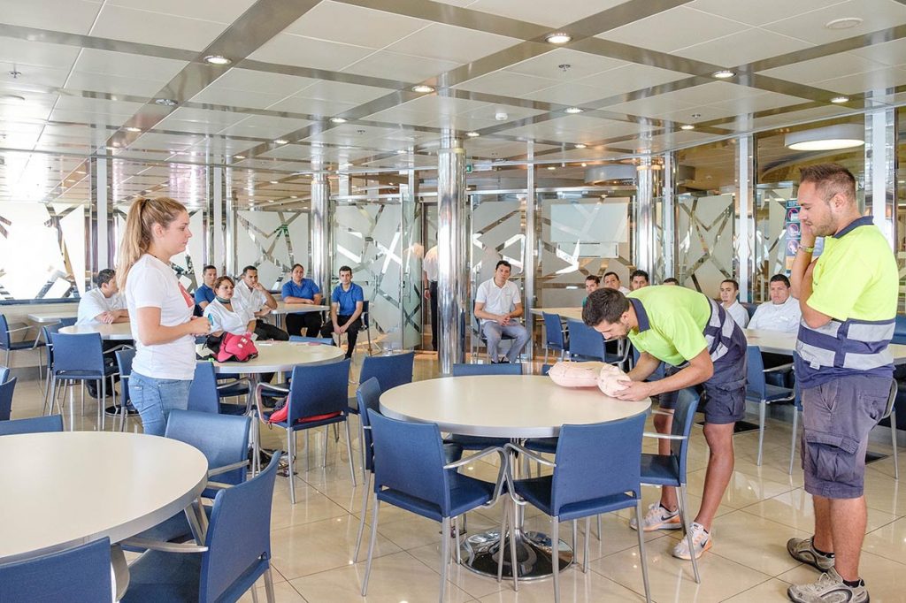 En esta línea, el personal de Baleària ha aprendido a actuar de forma rápida y eficaz frente a un atragantamiento mediante la maniobra de Heimlich, que consiste en presionar con los dos brazos el abdomen de la persona que está tosiendo mientras se le agarra desde la espalda.