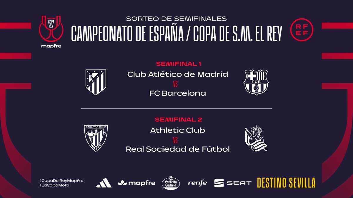 Atlético de Madrid-Barcelona y Athletic Club de Bilbao-Real Sociedad son las dos eliminatorias de semifinales de la Copa del Rey, según deparó el sorteo celebrado este viernes en la Ciudad del Fútbol de Las Rozas (Madrid).