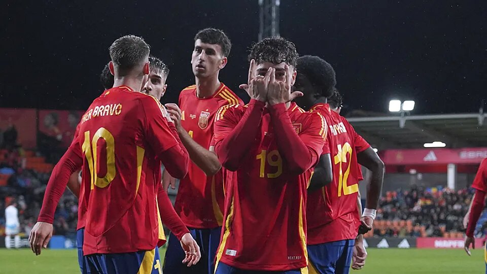 Y llegó, a los 19 minutos, la primera alegría para el equipo en forma de golazo. Lo firmó Jan Virgili, debutante con la sub-21 y tan eléctrico como siempre. El extremo catalán recibió el balón por banda izquierda después de una larguísima posesión, recortó hacia dentro y le pegó con sutileza y potencia, una parábola fantástica imposible para el portero sanmarinense. Estreno soñado para Virgili, piña y abrazos de nuestros chicos.