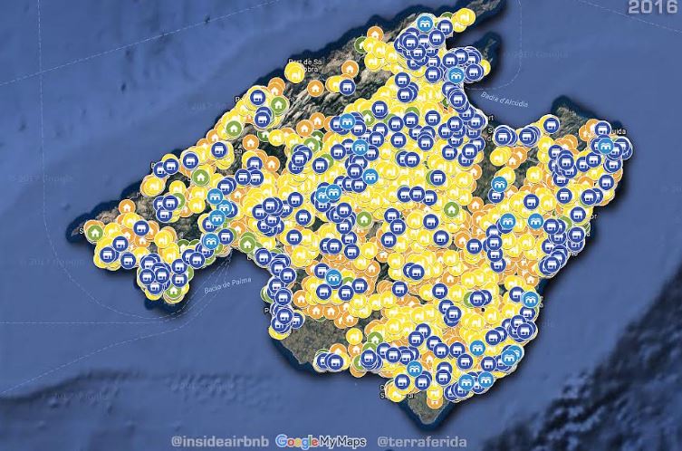 La asociación Terraferida ha publicado este martes un mapa interactivo con la información actualizada de todos los alojamientos turísticos que ofrece Airbnb y también un mapa con los alojamientos turísticos que sí publicitan su licencia con el objetivo de "abrir un debate" sobre este fenómeno ya que, según aseguran, su "intención no es criminalizar".