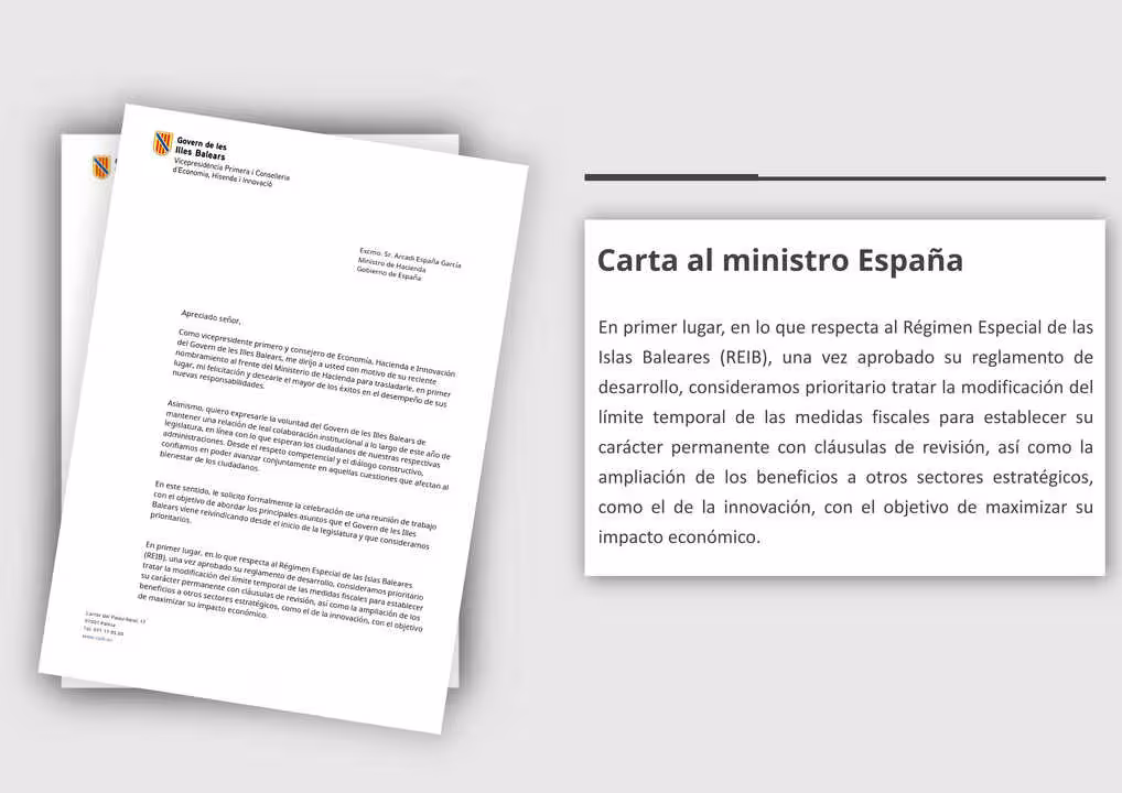 Entre los asuntos prioritarios, Costa destaca la necesidad de renegociar el Régimen Especial de las Illes Balears (REIB). En este sentido, plantea la modificación del límite temporal de las medidas fiscales para establecer su carácter permanente con cláusulas de revisión, así como la ampliación de los beneficios a sectores estratégicos como el de la innovación.