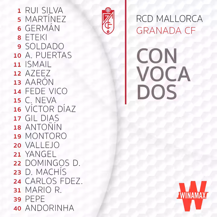 Diego Martínez ha ofrecido la lista de convocados para el partido de esta noche que le medirá al Mallorca en Son Moix. La expedición del Granada partía esta mañana a Palma con el ovjetivo de intentar apurar sus opciones de jugar la próxima campaña en Europa.