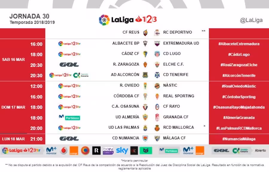 Ya se conocen los horarios de la jornada 30 de la Liga 123. El Mallorca se medirá a la UD Las Palmas el domingo 17 de marzo a las 20 horas. Recordar que en el partido de la primera vuelta disputado en el Estadio de Son Moix el partido terminó con un resultado de empates a dos goles.