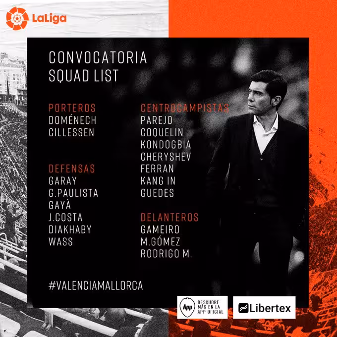 El técnico del Valencia CF ha ofrecido durante la jornada de este sábado la convocatoria de cara al partido de este domingo ante el Mallorca en Mestalla.