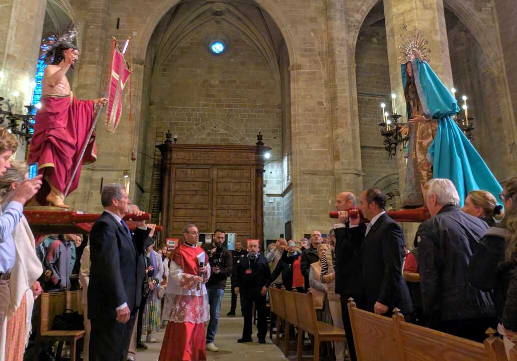 La celebración ha comenzado con la tradicional procesión del Encuentro, uno de los momentos más significativos de la liturgia pascual en Mallorca. Durante este rito, la imagen del Cristo Resucitado, y la de la Virgen de Pascua han avanzado en procesión hasta encontrarse en el espacio central de la nave principal de la Seu.