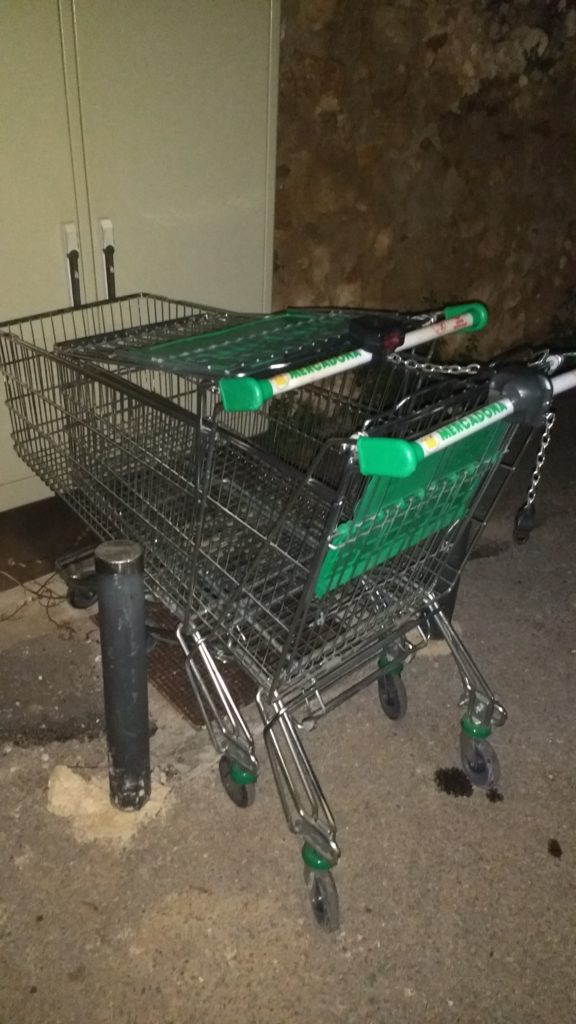 No contento con eso, si pasado el tiempo la empresa no ha recogido el carrito y necesita otro, los deja aparcados uno tras otro y enganchados porque el euro debe recuperarse del carrito. Sirva la foto para su escarnio y vergüenza"