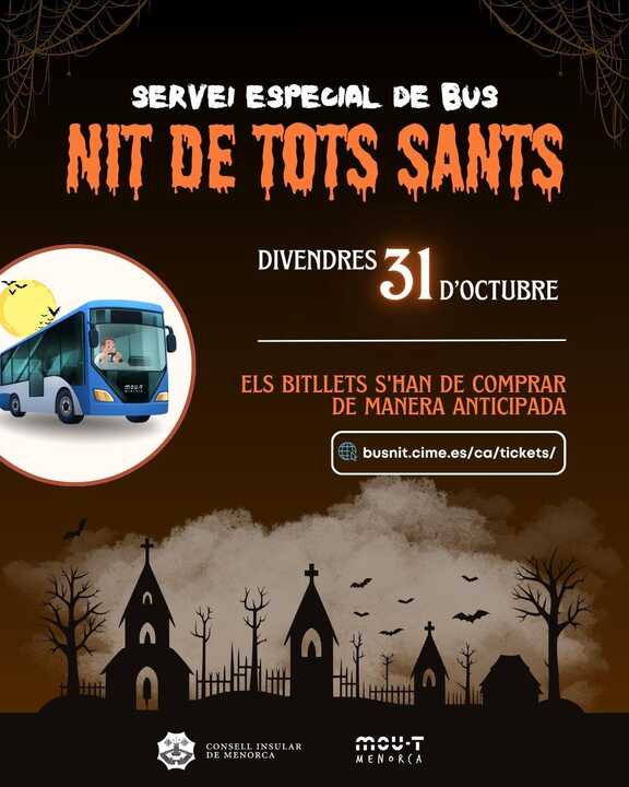 El departamento de Movilidad del Consell Insular de Menorca activará un dispositivo especial de Bus de Nit para la madrugada de Todos los Santos, incluida la noche del viernes, 31 de octubre, y la madrugada del sábado, 1 de noviembre, con el objetivo de facilitar los desplazamientos seguros entre municipios de la isla con motivo de las actividades nocturnas previstas durante la celebración.