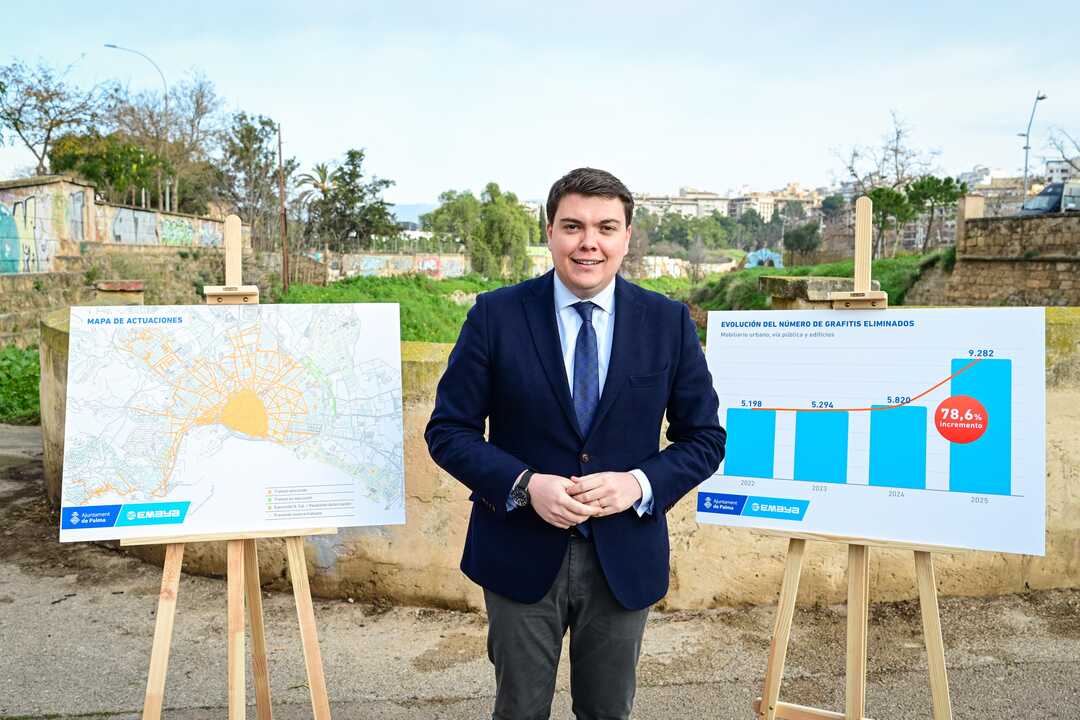 El teniente de alcalde y regidor de Medi Natural, Entorns Saludables, Mercats i Innovació, y presidente de Emaya, Llorenç Bauzá de Keizer, ha presentado este viernes los datos sobre retirada de grafitis en Palma a lo largo de 2025, periodo durante el cual los operarios de la empresa municipal han eliminado casi 9.300 de estos elementos vandálicos: concretamente, 9.282 grafitis.