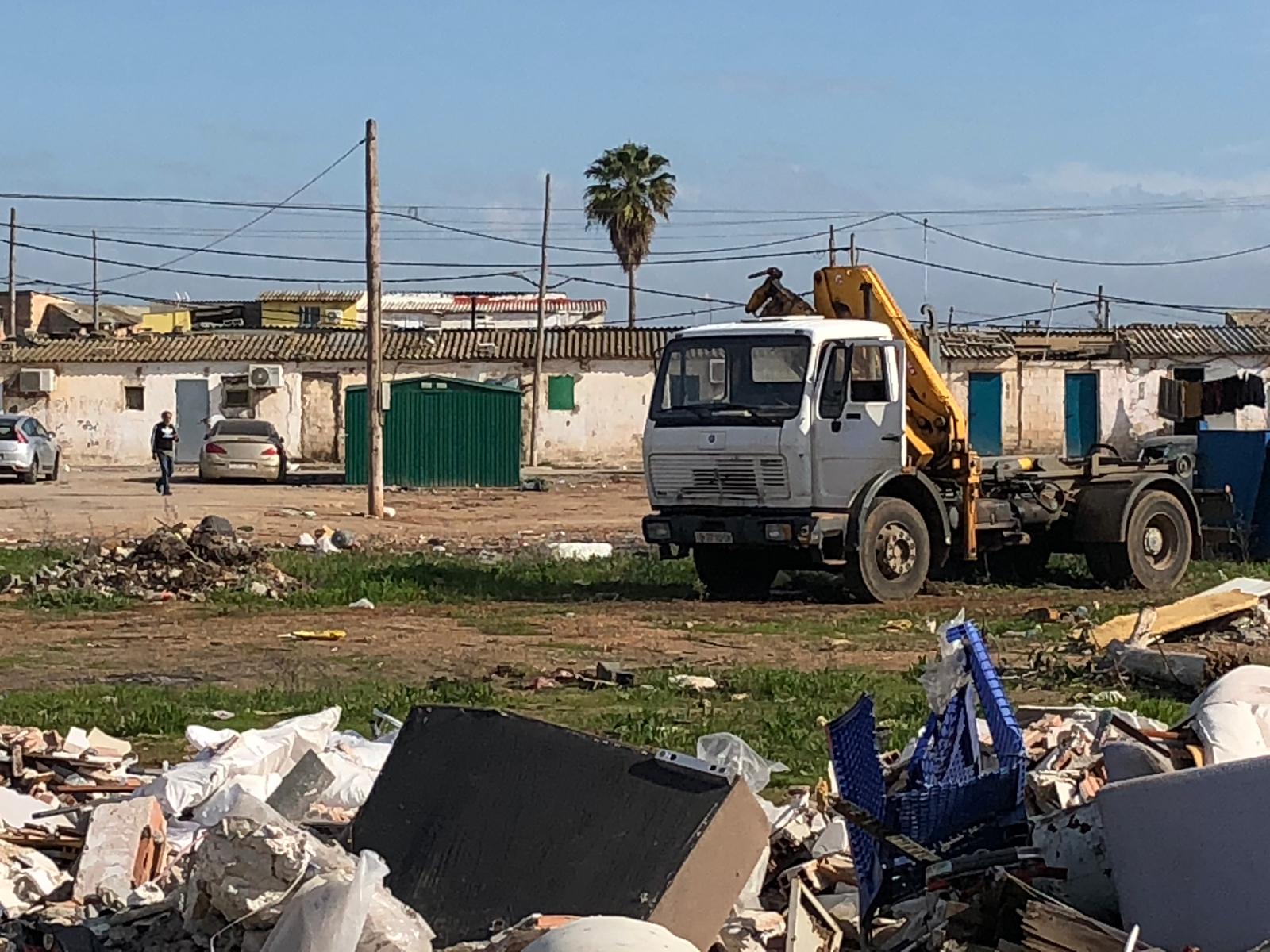 La empresa de mantenimiento del poblado ha acudido al poblado para retirar la basura acumulada allí. Han entrado con una grúa y una excavadora.