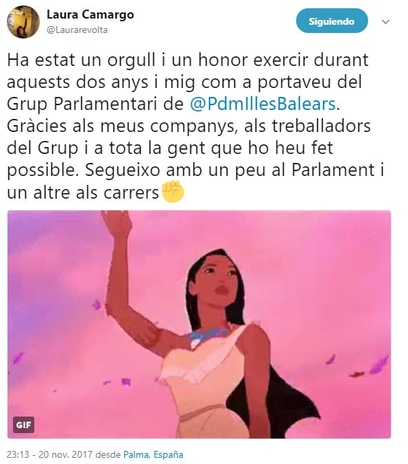 Horas después de firmar su renuncia, Camargo se despidió a lo Pocahontas en Twitter. "Ha sido un orgullo y un honor ejercer durante estos dos años y medio como portavoz del Grupo Parlamentario Podem Illes Balears", escribió.