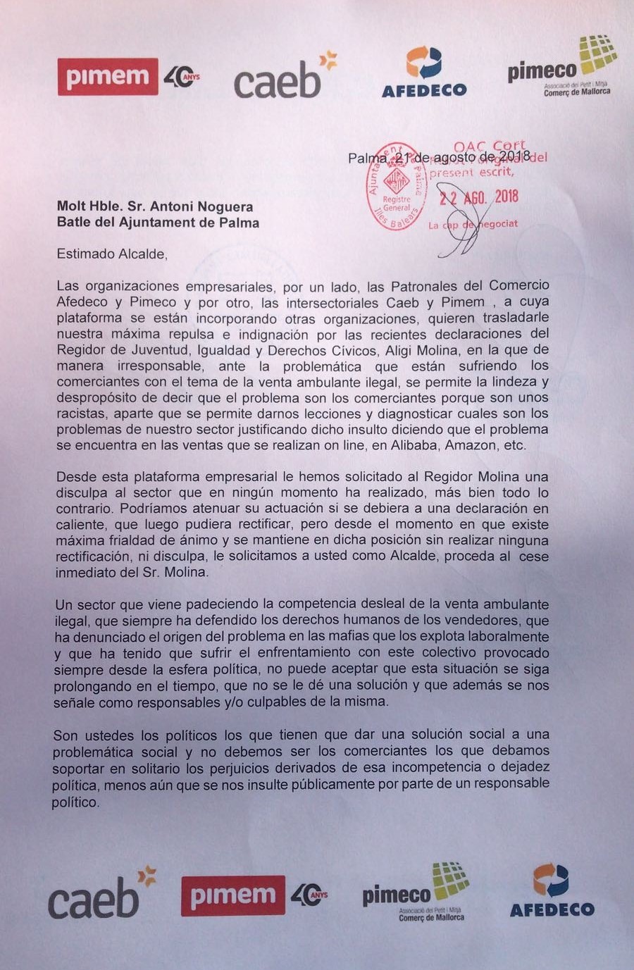 Esta mañana se ha presentado en el registro del Ajuntament de Palma un escrito firmado por CAEB, PIMEM, AFEDECO y PIMECO en el que se le manifiesta al alcalde de Palma, Antoni Noguera, la indignación por las irresponsables y desafortunadas declaraciones realizadas por el regidor de Juventud, Igualdad y Derechos Cívicos, Aligi Molina, que ante la situación de la venta ambulante ilegal, "se ha permitido el despropósito de afirmar que el problema son los comerciantes, a los que califica de racistas por entender, según dicho regidor, que éstos deberían de preocuparse más por la competencia que les hacen Alibaba y Amazon y las grandes empresas, que fijarse en los vendedores ilegales como chivos expiatorios".