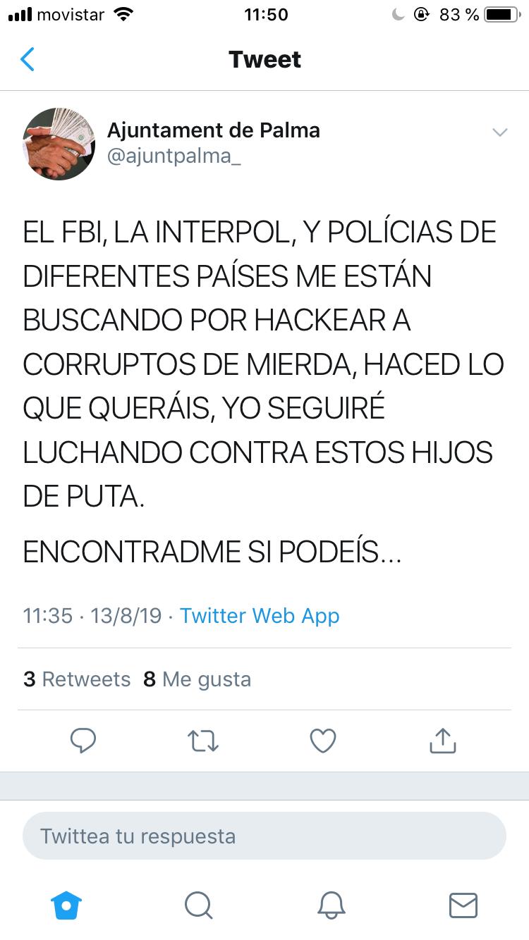 La cuenta de Twitter del Ajuntament de Palma ha sufrido este martes un ataque de un hacker informático. "Esta cuenta ha sido hackeada por corrupción", asegura el nuevo dueño de la cuenta.