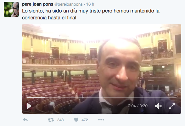 A través de sus redes sociales se puede ver como el diputado expresa su tristeza por el resultado de la investidura.