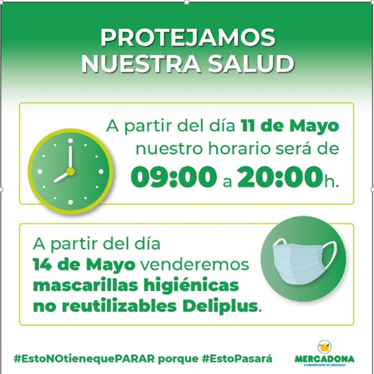 Mercadona, con el objetivo de proteger la salud y seguridad de sus clientes y trabajadores además de asegurar el abastecimiento de sus tiendas, informa que procede a actualizar las medidas adoptadas los días 16, 19, 23, 26 de marzo y 3 de abril, completándola con otras adicionales que entrarán en vigor el lunes 11 y el jueves 14 de mayo, respectivamente, y que para una mejor identificación están marcadas en negrita.
