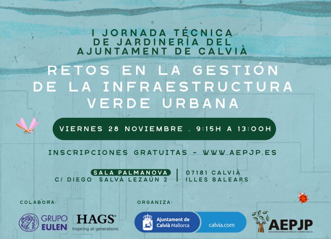 El evento, que tendrá lugar el próximo viernes 28 de noviembre, tiene por lema "Retos en la Gestión de la Infraestructura Verde Urbana" y pretende ser un foro de reflexión y debate para compartir conocimientos, experiencias y nuevas estrategias en el manejo de los espacios verdes de pueblos y ciudades. La jornada se desarrollará de 9:15 h a 13:00 h en la Sala Palmanova y tendrá carácter gratuito para las personas interesdas previa inscripción a través de la web de la AEPJP (www.aepjp.es).