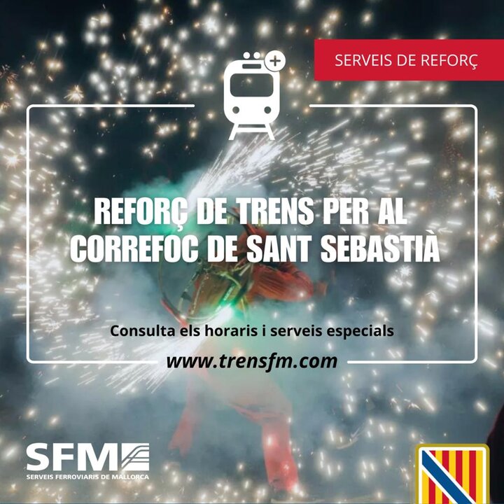 Servicios Ferroviarios de Mallorca (SFM) ha programado trenes especiales de refuerzo para este domingo 26 de enero con motivo de la celebración del tradicional correfoc que cierra las fiestas de San Sebastià .