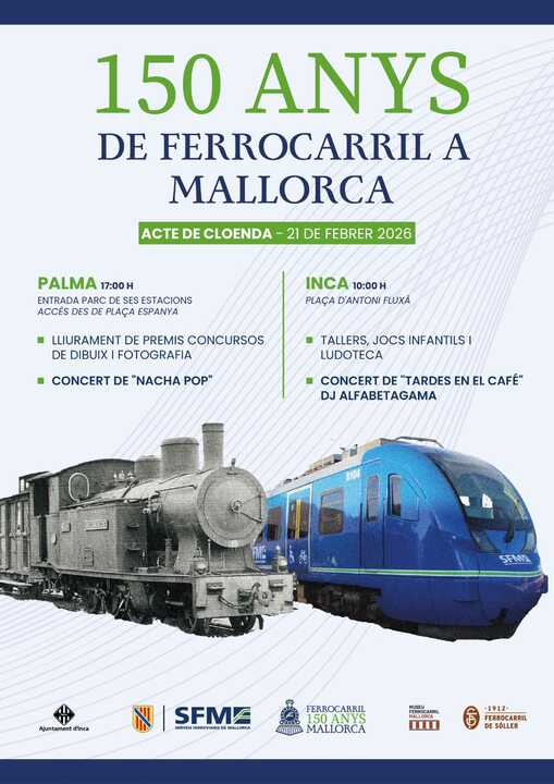 Serveis Ferroviaris de Mallorca (SFM) celebra el próximo sábado 21 de febrero los actos de clausura de la conmemoración del 150º aniversario de la puesta en marcha del primer tren en Mallorca, en la línea entre Palma e Inca en 1875.