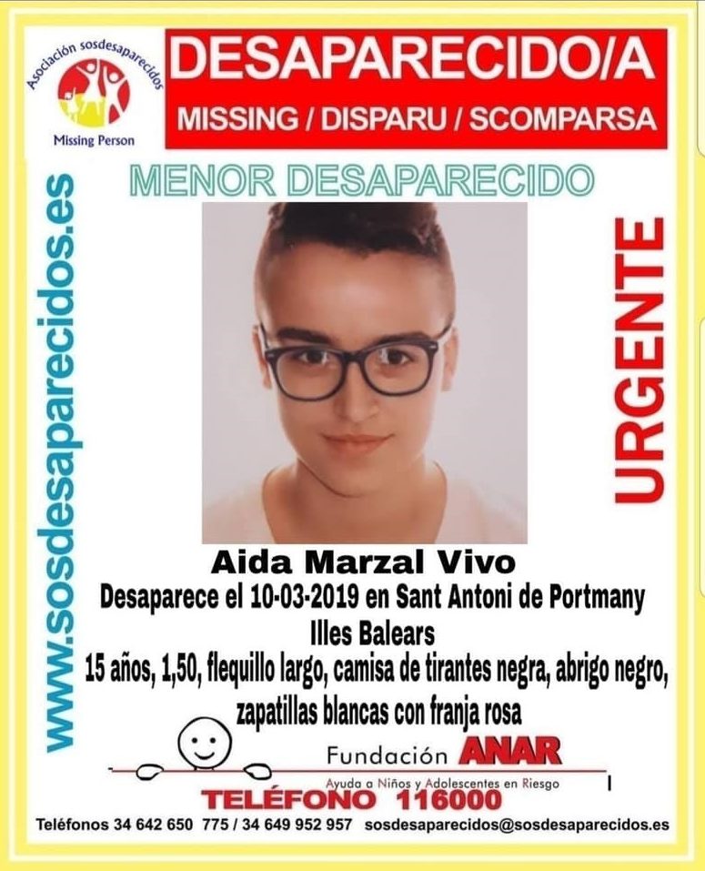 La menor desapareció el pasado 10 de marzo en el municipio ibicenco de Sant Antoni de Portmany. Mide 1,50 metros y tiene el flequillo largo. Llevaba una camisa de tirantes negra, abrigo negro y zapatillas blancas con franja rosa, según aparece en el cartel difundido.