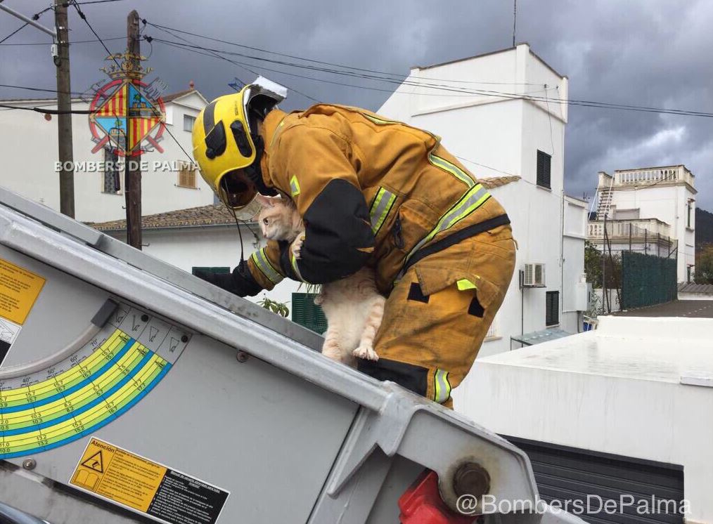 Los Bombers de Palma han rescatado esta mañana a un gato que se encontraba asustado y atrapado en el tejado de una casa.