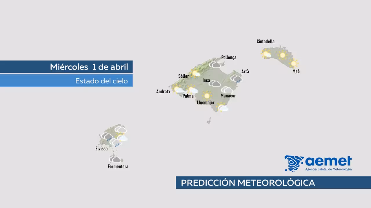 La Agencia Estatal de Meteorología prevé para mañana miércoles en Baleares cielo nuboso o muy nuboso con chubascos en general débiles, que podrían ser de nieve en torno a 1100 m especialmente durante la tarde.
