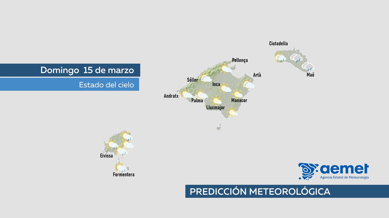 La Agencia Estatal de Meteorología prevé para este sábado, 14 de marzo en Baleares, cielo cubierto con lluvias y chubascos a partir de la mañana que pueden ser localmente fuertes y que además podrían ir acompañados de tormenta y granizo pequeño. La cota de nieve bajará durante la tarde a 1.000 metros.