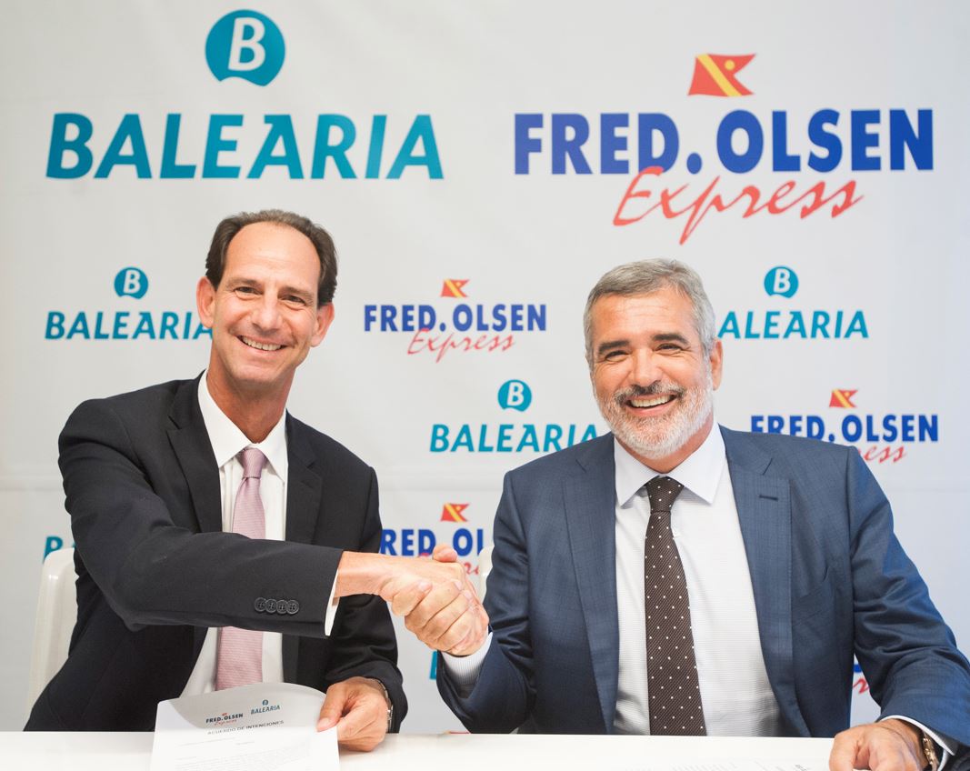 El director general de Fred. Olsen Express, Andrés Marín, y el presidente de Baleària, Adolfo Utor, han firmado un acuerdo para empezar a operar conjuntamente rutas entre la Península y Canarias, a través de su nuevo proyecto Canary Bridge Seaways (CBS), a partir de mediados de noviembre.