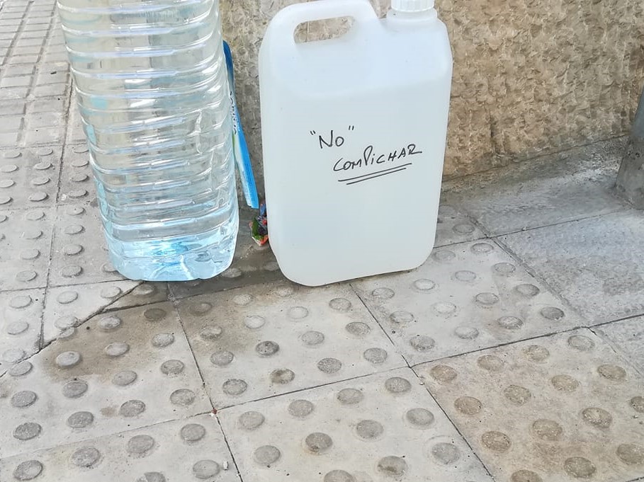 Refleja el método rudimentario para evitar que los animales, mayoritariamente perros, orinen en las esquinas. Por si algún can tiene dudas de si la garrafa es para beber... Escrito está. No compichar. Pues eso.